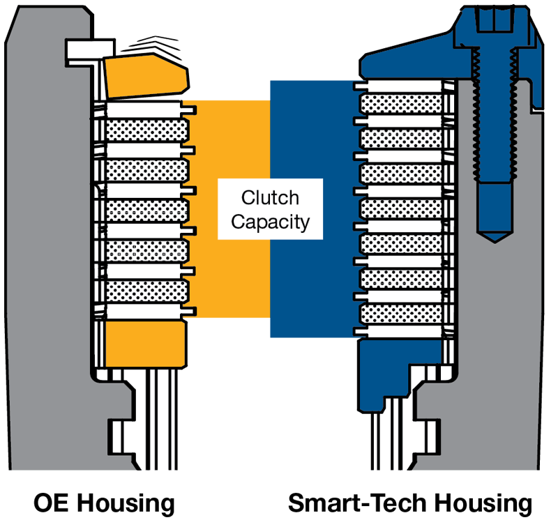 Stop the flex and you stop 3-4 clutch failure. The Sonnax Smart-Tech housing’s apply and backing plates surround a larger clutch pack area to keep the clutches parallel and maximize protection against overheating.
